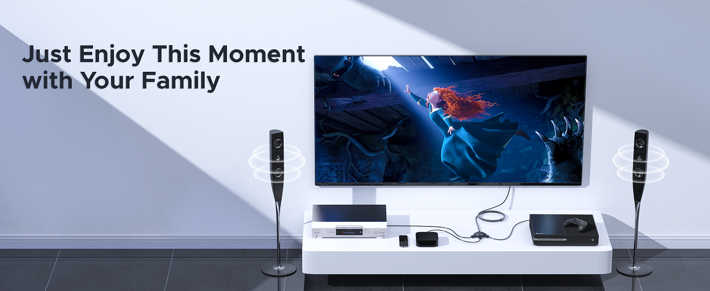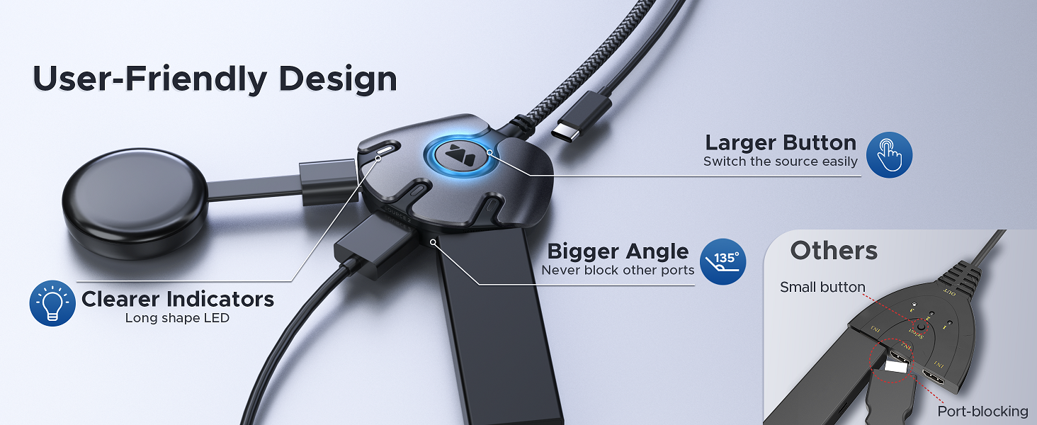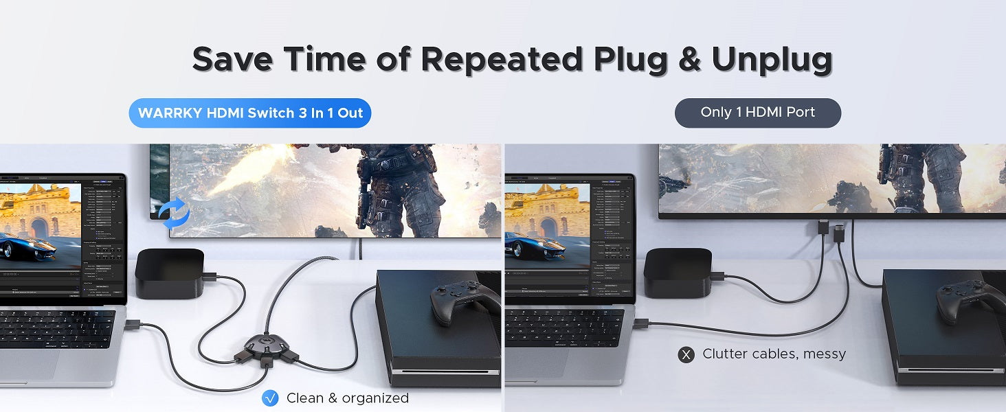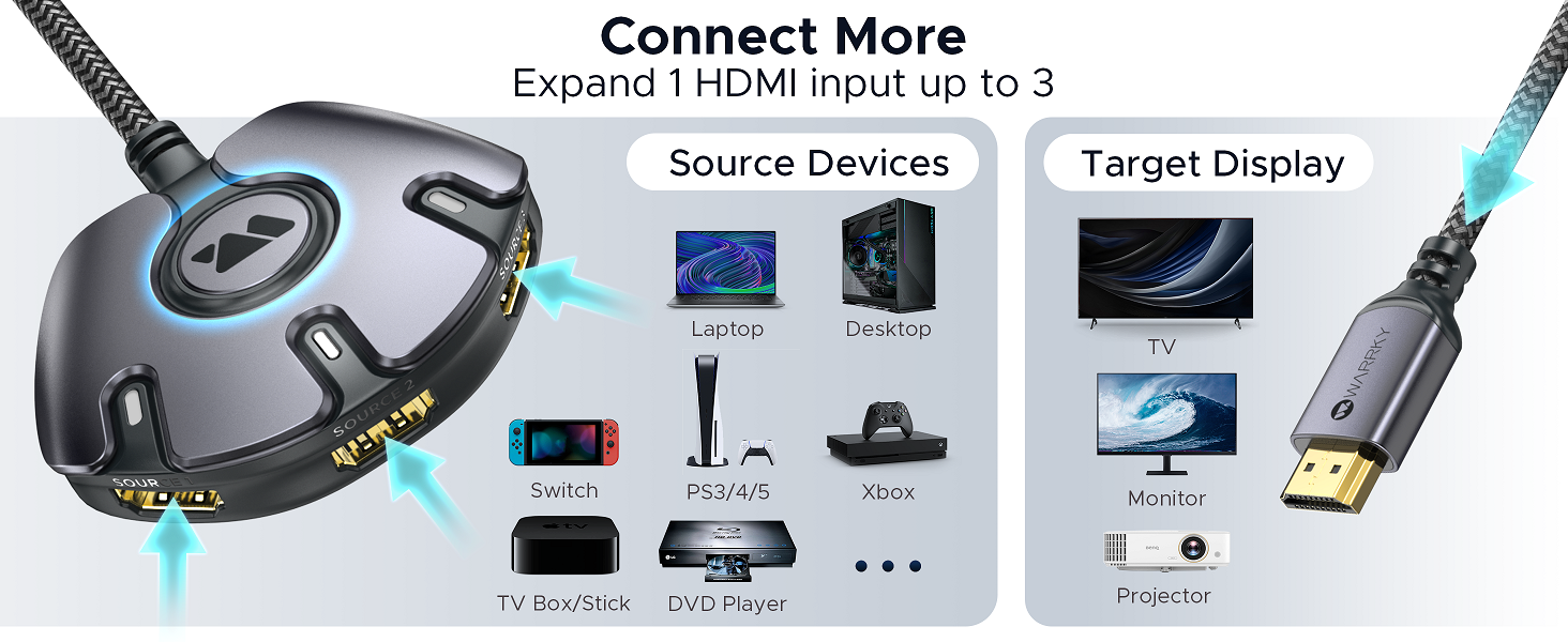 One-click switch between 3 source HDMI devices and swap the screen content. No more hassles.
