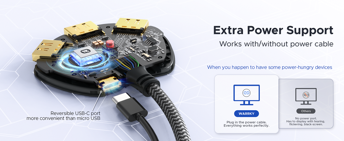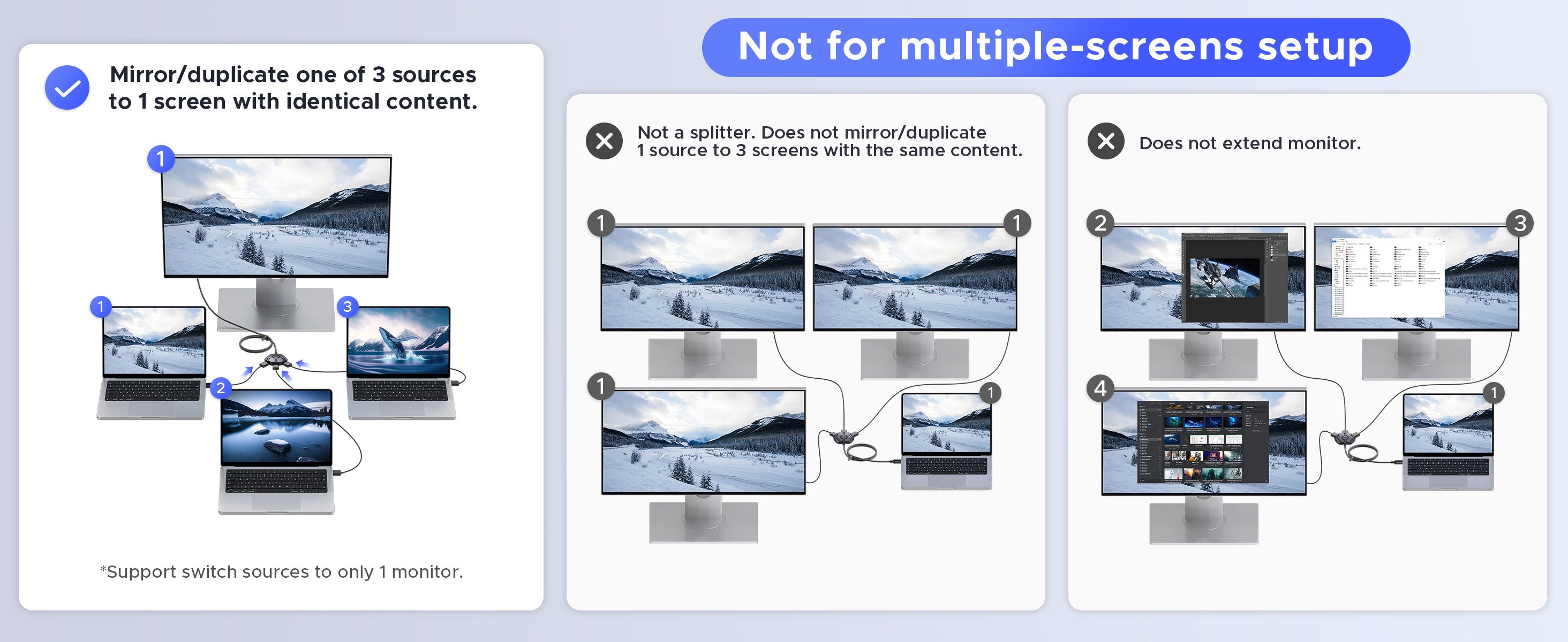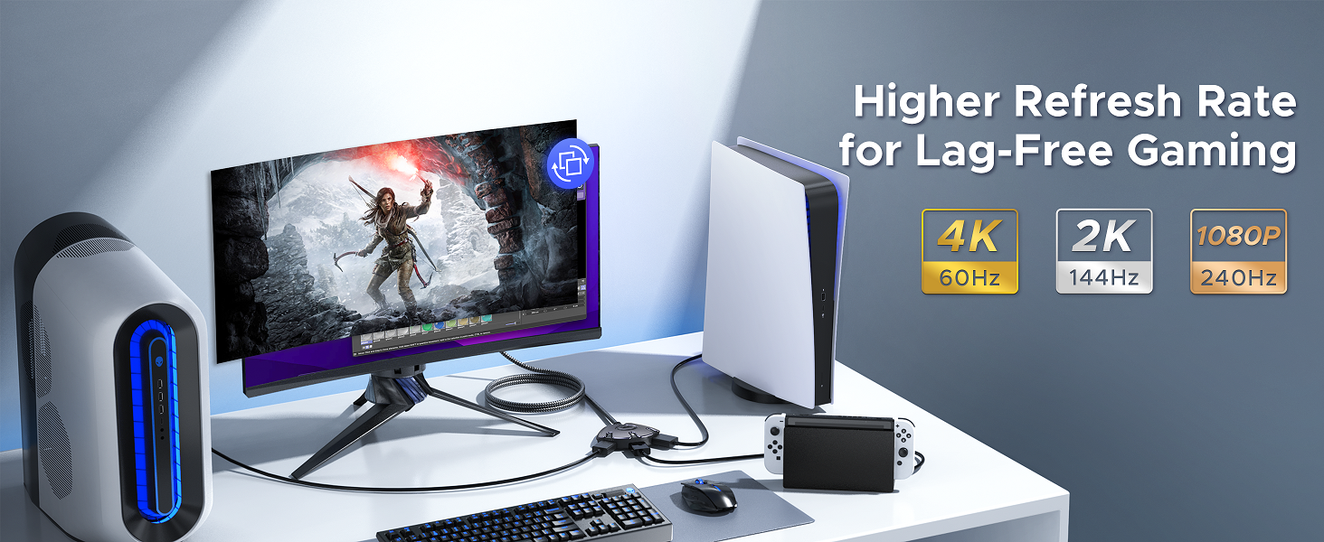 One-click switch between 3 source HDMI devices and swap the screen content. No more hassles.