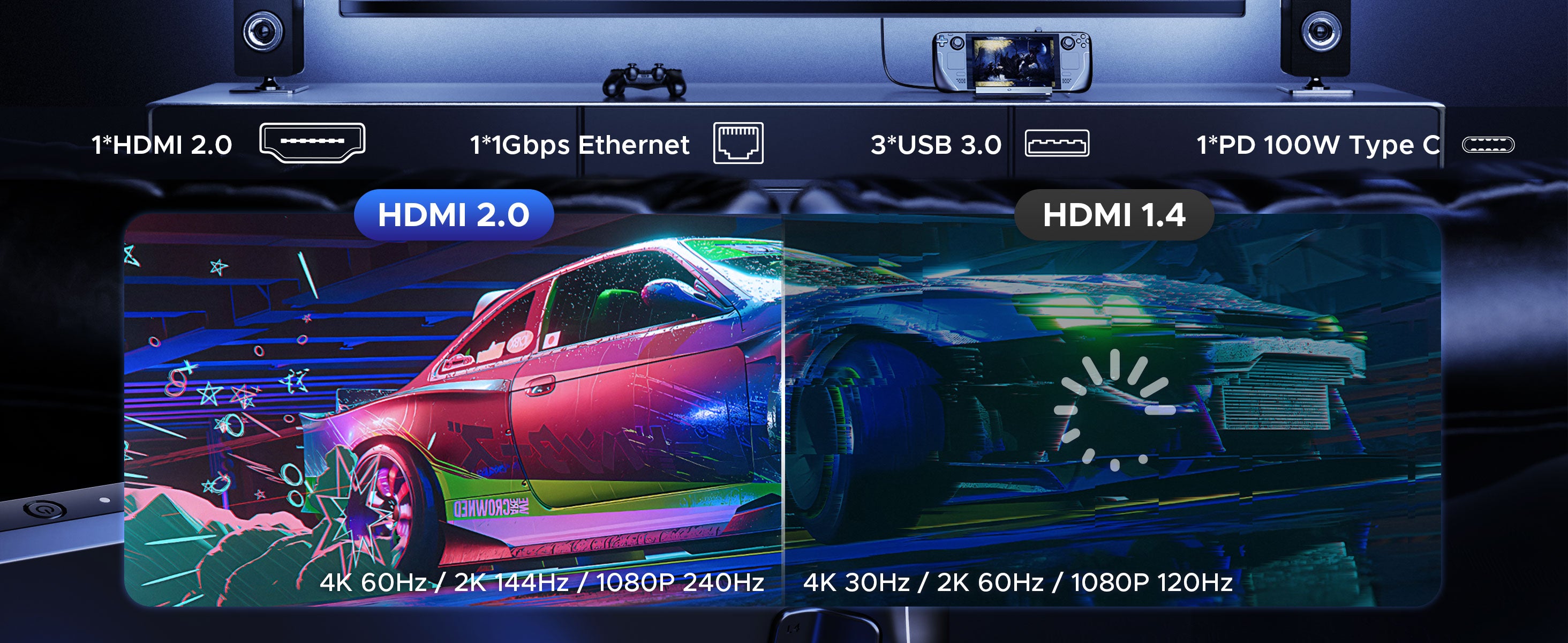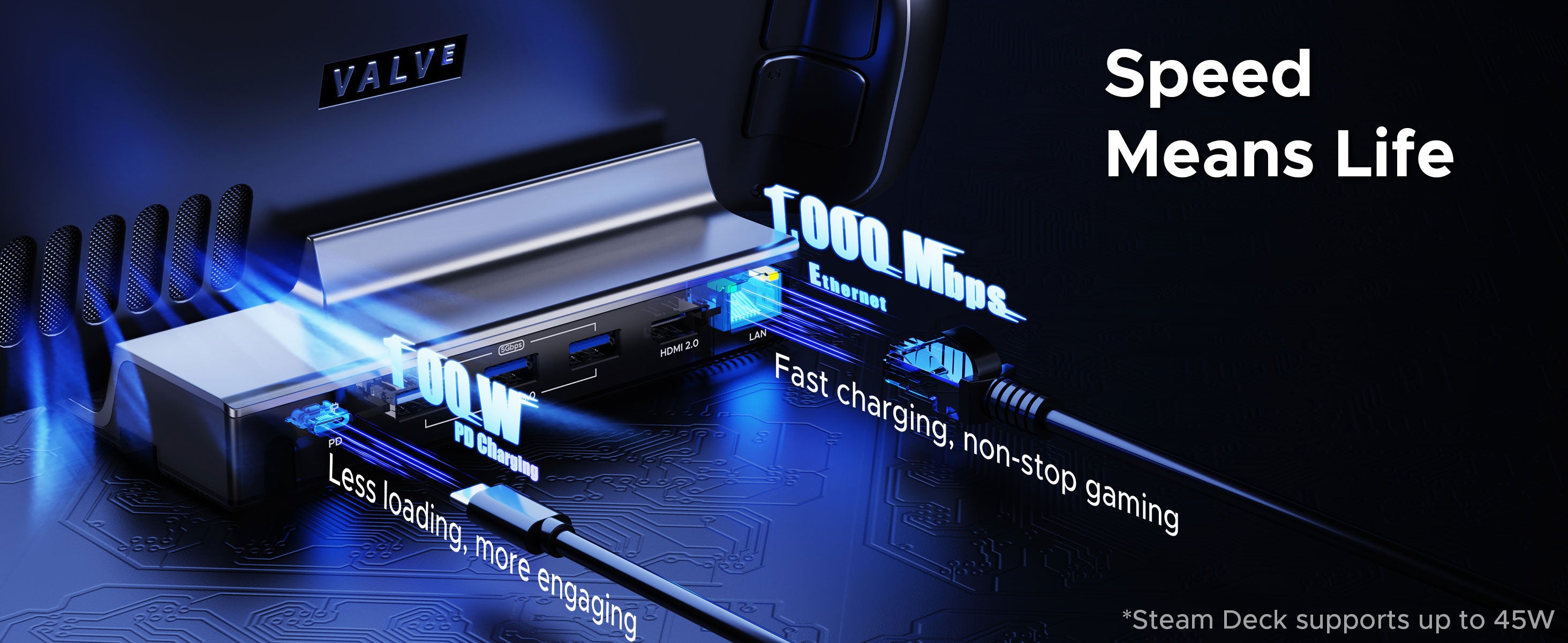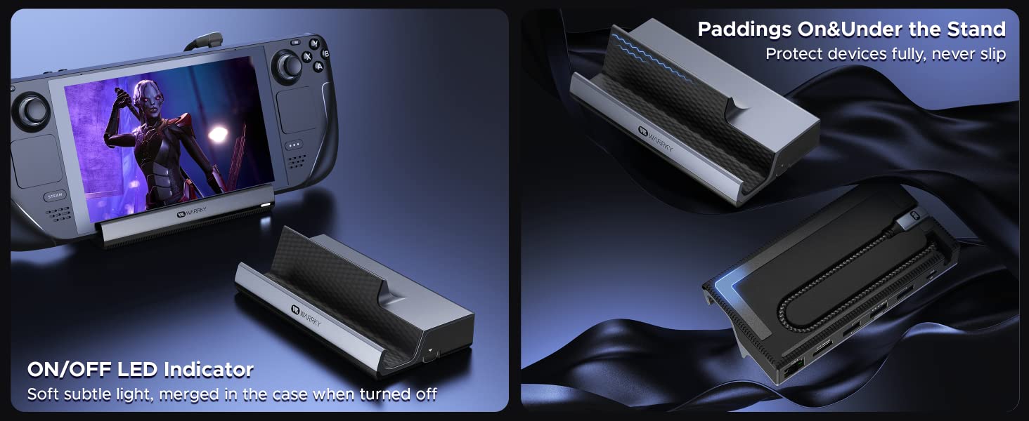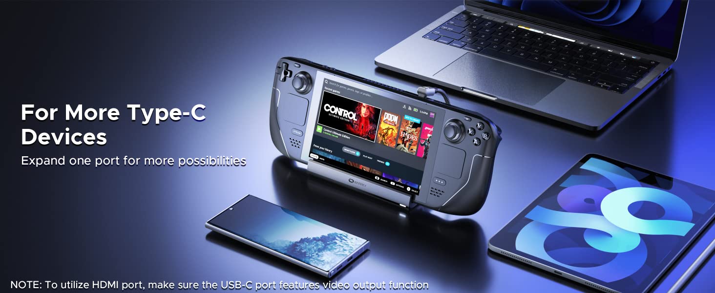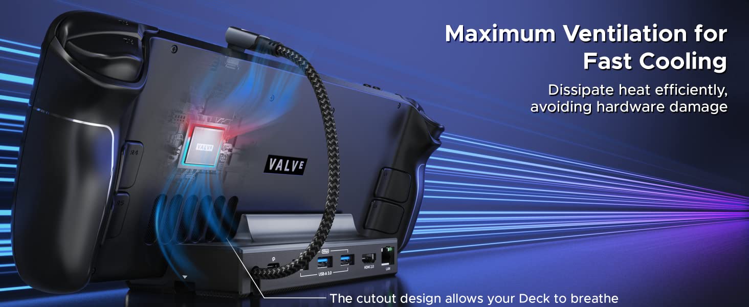 Connect the dock with the original charger for sufficient power. Change an HDMI cable (version 2.0 or above). When playing 3A games, lowering the resolution would increase the frame rate. Update the Steam OS to the latest version.